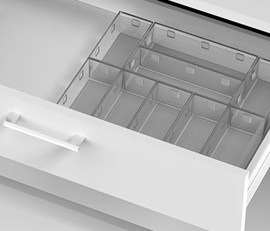 Sowohl in Auszügen als auch an Türen und Wänden kann das System zur Organisation genutzt werden. Zur flexiblen Kombination der Behälter in stehender Form helfen mitgelieferte Verbindungselemente. Um die Schalen auch hängend nutzen zu können, sind in dem Set zwei Leisten zur Montage an der (Schrank-)Wand enthalten. Die Behälter können jederzeit von den Leisten abgenommen und stets neu angeordnet werden.